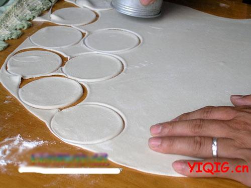 找一个大小适中的铁罐或其他器具(图上这个是暖水瓶盖,边缘太厚,不太好,尽量找一个薄的圆形器具),往面皮上按出一个个圆片。