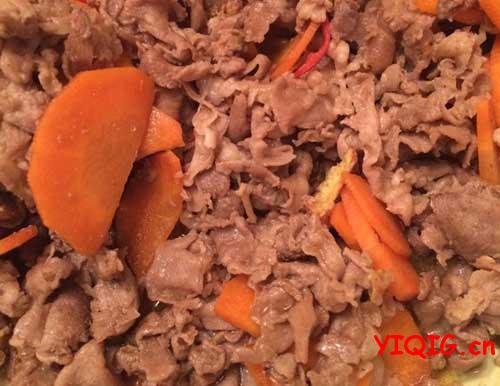 6.第五个小招:锅中放正常的用油,先放入蒜片;胡萝卜再放羊肉放在上边,先别动,直到底部呈焦状后再翻动