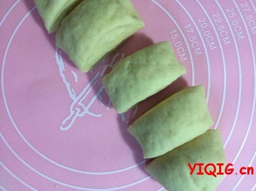 用手将面团搓成长条,刀切成适合大小的坯子,擀薄,撒上葡萄干(用水浸泡一下最好,用之前拧干液体,均匀铺撒在面团上,也可放其他果干),然后卷起来。