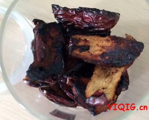 炒红枣:把新买的枣(或者把枣撕成一小块)放在干锅中炒一会儿,能看到表皮开始变黑,在稍微炒一会就可以盛出来了。