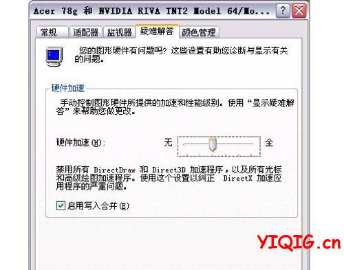 如果喜欢使用WMV或RealOne欣赏电影,想将其中的精彩画面保存来了,此时发现PrintScreen键“抓拍”的只是播放器的界面,而播放窗口则是一片漆黑!这该怎么办呢?(www.yiqig.cn一起过)其实这是由于播放电影时调用了DirectDraw功能加速视频造成的,并且DirectDraw本身不支持使用PrintScreen抓屏。此时只要在桌面“属性→设置→高级→疑难解答”中将“硬件加速”调至关闭加速,然后正常播放电影再按下PrintScreen键进行抓图即可(如图)。