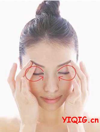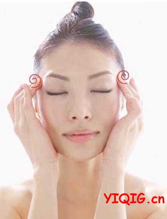2、用中指和无名指按住太阳穴,然后用力的以画圈圈的方式按摩。用力地给太阳穴按摩的话有利于快速的去除起床气,重新恢复眼睛的清澈明亮。对于经常用眼的人来说,可以有效地去除疲劳。