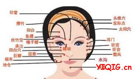 攒竹穴--缓和眼睛的疲劳和浮肿。眉头下方凹陷之处即是。眼睛疲劳以及头痛,都会引起眼部四周的浮肿。此穴位可以缓和不适。