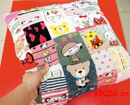 将穿破的长统袜筒部剪下,里面塞满棉花或剪碎的海绵,然后将一个个袜筒接缝起来,盘卷成圆盘状,用针线缝好,上面再加一些小装饰,则就成了美观实用的靠垫了。
