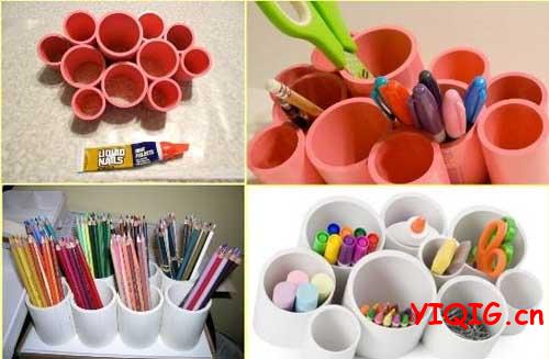 一个创造性的想法来组织你的办公桌或全部工艺材料从你的孩子正在使用PVC管材办公桌组织者。切管不同大小(你可以可爱的他们直接或对角线)。沙边,以消除任何分裂,使其临危不乱,并使用永久性胶水来修复管道一起在一个板(木板或塑料)。
