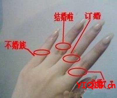 无名指:从古罗马时代以来习惯将婚戒戴在其上,相传此指与心脏相连,最适合发表神圣的誓言。而无名指上有重要穴道,戒指戴其上可以适度按压肌肉,有安定情绪之效。