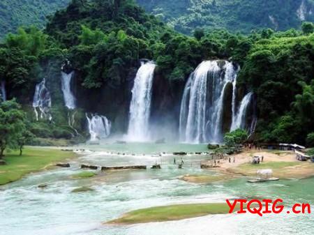 德天大瀑布发源于归春河的上游,自北南流的归春河被峙在江心的浦汤岛所阻挡,使河水激石咆哮,夺路而下,形成高达50余米的瀑布。远望德天瀑布,只闻水声轰鸣,响如滚雷。巨大的跌水分成数股飞泻直下,水花四溅,烟雾溟蒙,在阳光下,色彩缤纷,蔚为壮观。瀑布景观随河水流量的多寡而变化,河水有季节变化,瀑布亦因而有四季景色。春天来临,崖草泛青,山花吐蕊,木棉花盛开,归春河两岸一片红霞,不是秋色,胜似秋色。(一起过 www.yiqig.cn)在红花万朵丛中,德天瀑布犹如一匹银色素洁的白练,轻盈欢快地舞蹈着,夏季,则山洪始发,洪流滚滚,水声隆隆,如万马奔腾,鸣金击鼓,震撼山谷。此时,若解衣脱鞋,跃入水中游玩,看眼前之飞舞银龙,喷吐着水珠云雾在自己体上头顶,不仅消暑避炎,而且若置仙境之中,其乐无穷。